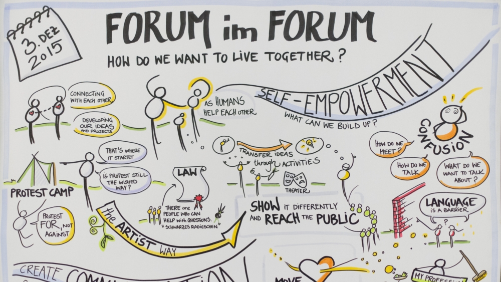 inspired by the refugee protest camp at paulustor/stadtpark in 2015, forum im forum is an open space at rathaus der herzen taking place once a month (every 1st thursday) dealing with the question „how do we want to live together?“.